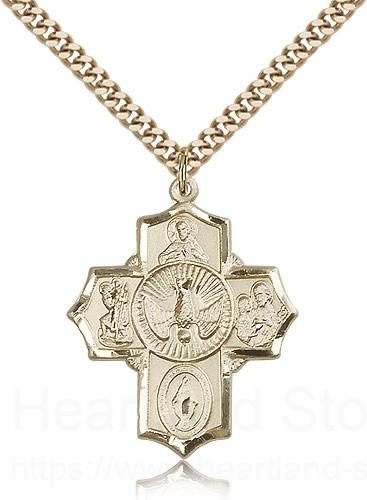 This 5 Way Cross Pendant is paired with a 24 inch stainless steel gold-tone heavy curb chain as pictured. All medals are gift boxed in a light blue velvet jewelry box ready for gift giving.