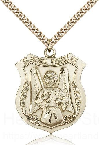This St. Michael the Archangel Medal is paired with a 24 inch stainless steel gold-tone heavy curb chain as pictured. All medals are gift boxed in a light blue velvet jewelry box ready for gift giving.