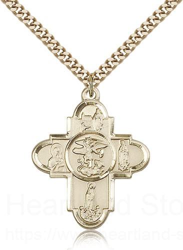 This Our Lady 5 Way Cross Pendant is paired with a 24 inch stainless steel gold-tone heavy curb chain as pictured. This special 5-Way cross is designed with the beautiful images of Our Lady of Lourdes at the top, Our Lady of Carmel at the right, Our Lady of Fatima at the bottom, Our Lady of Perpetual Help at the left, and in the center is St. Michael. All medals are gift boxed in a light blue velvet jewelry box ready for gift giving.