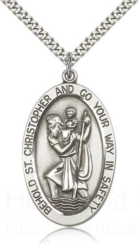 This St. Christopher Medal is paired with a 24 inch stainless steel heavy curb chain as pictured. All medals are gift boxed in a light blue velvet jewelry box ready for gift giving.
