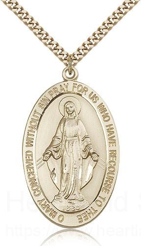 This Miraculous Medal is paired with a 24 inch stainless steel gold-tone heavy curb chain as pictured. All medals are gift boxed in a light blue velvet jewelry box ready for gift giving.