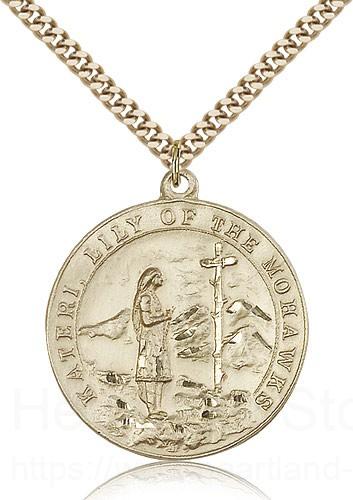 This St. Kateri Medal is paired with a 24 inch stainless steel gold-tone heavy curb chain as pictured. All medals are gift boxed in a light blue velvet jewelry box ready for gift giving.