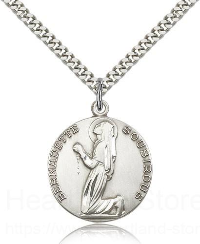 This St. Bernadette Medal is paired with a 24 inch stainless steel heavy curb chain as pictured. All medals are gift boxed in a light blue velvet jewelry box ready for gift giving.