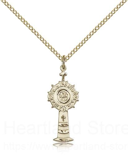 This Monstrance Medal is paired with an 18" gold filled light curb chain as pictured. All medals are gift boxed in a light blue velvet gift box ready for gift giving.