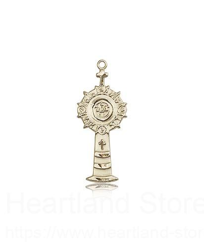 This Monstrance Medal is made of 14 Karat Gold. The jewelry pendant is sold as pictured and does not come with a chain. All medals are gift boxed in a light blue velvet jewelry box ready for gift giving.