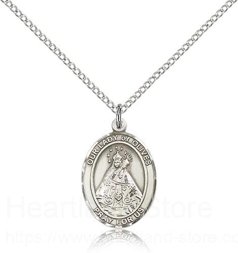 This Our Lady of Olives Pendant is made of sterling silver and is approximately the size of a nickel. The jewelry pendant is paired with an 18 inch sterling silver light curb chain as pictured. All medals are gift boxed in a beautiful blue velvet hinged jewelry gift box.