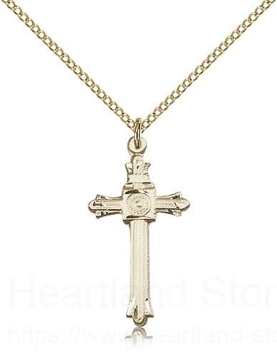This Cross Pendant is paired with an 18" gold filled light curb chain as pictured. All medals are gift boxed in a light blue velvet gift box ready for gift giving.