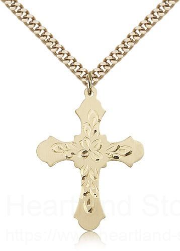 This Cross Pendant is paired with a 24 inch stainless steel gold-tone heavy curb chain as pictured. All medals are gift boxed in a light blue velvet jewelry box ready for gift giving.