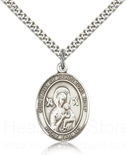 This Our Lady of Perpetual Help Pendant is made of sterling silver and is approximately the size of a quarter. The jewelry pendant is paired with a 24 inch stainless steel heavy curb chain as pictured. All medals are gift boxed in a beautiful blue velvet hinged jewelry gift box.
