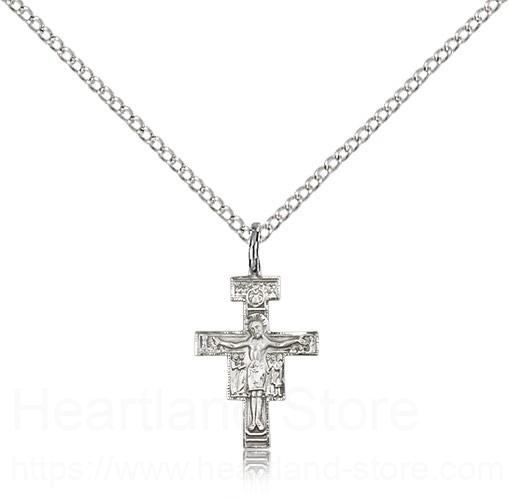 This San Damiano Crucifix Pendant is paired with an 18 inch sterling silver lite curb chain as pictured. All