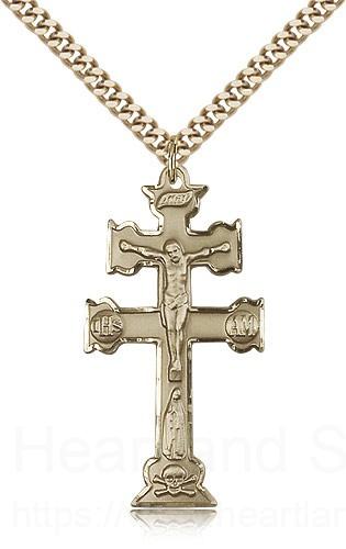 This Caravaca Crucifix Pendant is paired with a 24 inch stainless steel gold-tone heavy curb chain as pictured. All medals are gift boxed in a light blue velvet jewelry box ready for gift giving.
