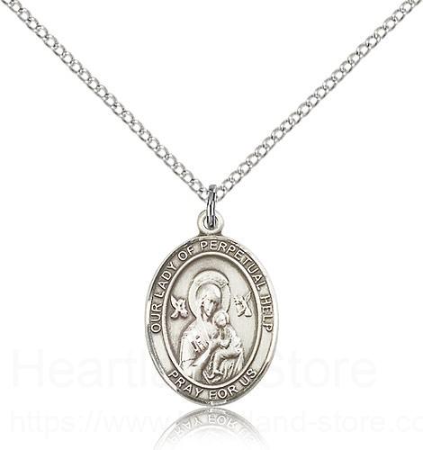 This Our Lady of Perpetual Help Pendant is made of sterling silver and is approximately the size of a nickel. The jewelry pendant is paired with an 18 inch sterling silver light curb chain as pictured. All medals are gift boxed in a beautiful blue velvet hinged jewelry gift box.