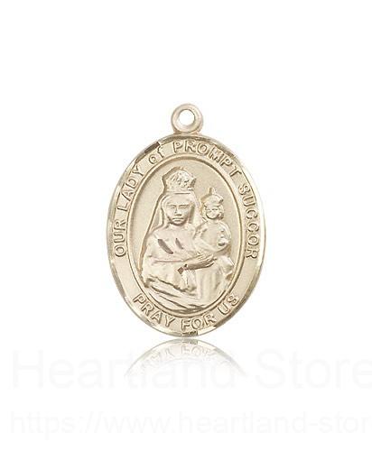 This Our Lady of Prompt Succor Pendant is made of 14 Karat Gold and is approximately the size of a quarter. The jewelry pendant is sold individually and does not come with a chain. All medals are gift boxed in a beautiful blue velvet hinged jewelry gift box.