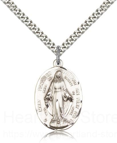 This Immaculate Conception Medal is paired with a 24 inch stainless steel heavy curb chain as pictured. All medals are gift boxed in a light blue velvet jewelry box ready for gift giving.