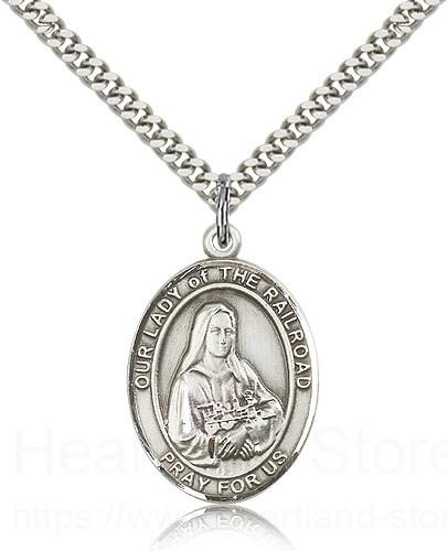 This Our Lady of the Railroad Pendant is made of sterling silver and is approximately the size of a quarter. The jewelry pendant is paired with a 24 inch stainless steel heavy curb chain as pictured. All medals are gift boxed in a beautiful blue velvet hinged jewelry gift box.