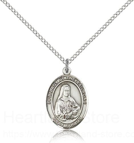 This Our Lady of the Railroad Pendant is made of sterling silver and is approximately the size of a nickel. The jewelry pendant is paired with an 18 inch sterling silver light curb chain as pictured. All medals are gift boxed in a beautiful blue velvet hinged jewelry gift box.