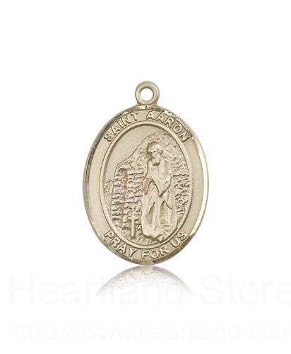 This St. Aaron Pendant is made of 14 Karat Gold and is approximately the size of a quarter. The jewelry pendant is sold individually and does not come with a chain. All medals are gift boxed in a beautiful blue velvet hinged jewelry gift box.