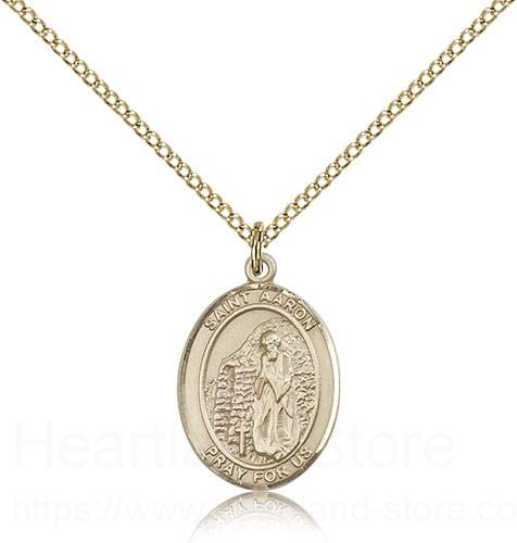 This St. Aaron Pendant is made of gold filled and is approximately the size of a nickel. The jewelry pendant is paired with an 18 inch gold filled light curb chain as pictured. All medals are gift boxed in a beautiful blue velvet hinged jewelry gift box.