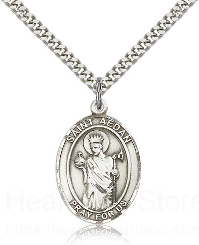 This St. Aedan of Ferns Pendant is made of sterling silver and is approximately the size of a quarter. The jewelry pendant is paired with a 24 inch stainless steel heavy curb chain as pictured. All medals are gift boxed in a beautiful blue velvet hinged jewelry gift box.