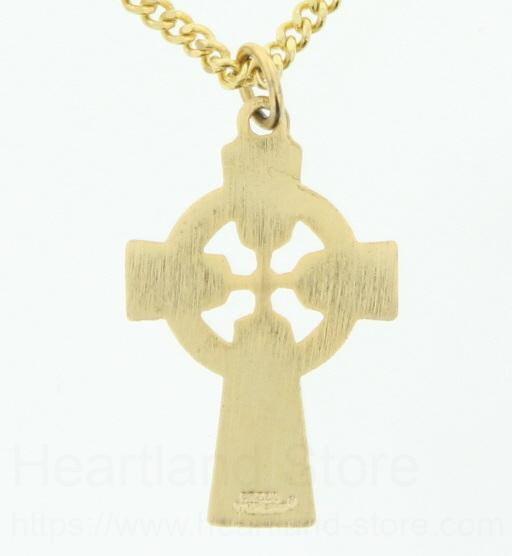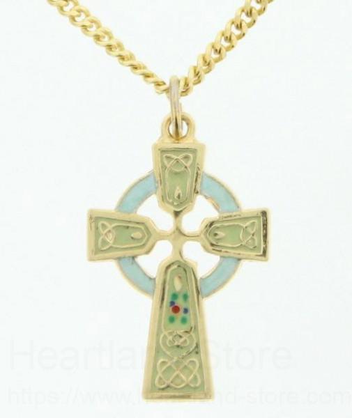 A wonderful Celtic Cross made of 22kt gold over sterling silver measures 1 inch high. This stunning Celtic Cross with a light green circle behind the Cross that represents eternal life, the sun or God's endless love. The Cross is in the shape of a windmill having Trinity Knot design ends. Pendant comes with a jump ring, an 18 inch gold plated over stainless steel chain with clasp with clasp, and a lovely velvet gift box.