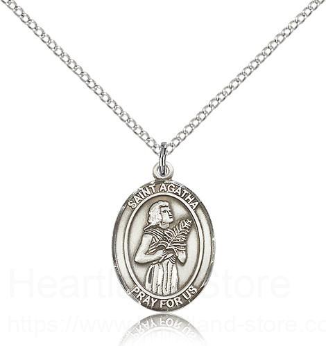 This St. Agatha Pendant is made of sterling silver and is approximately the size of a nickel. The jewelry pendant is paired with an 18 inch sterling silver light curb chain as pictured. All medals are gift boxed in a beautiful blue velvet hinged jewelry gift box.