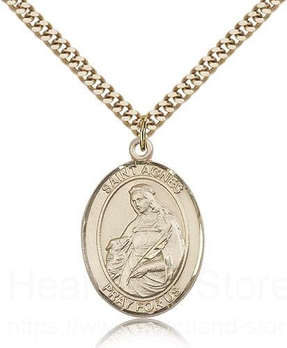 This St. Agnes of Rome Pendant is made of gold filled and is approximately the size of a quarter. The jewelry pendant is paired with a 24 inch gold filled heavy curb chain as pictured. All medals are gift boxed in a beautiful blue velvet hinged jewelry gift box.