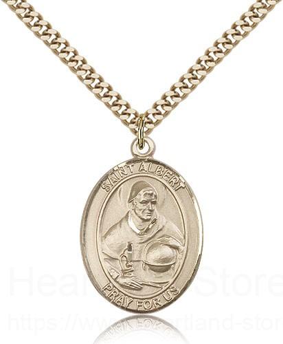 This St. Albert the Great Pendant is made of gold filled and is approximately the size of a quarter. The jewelry pendant is paired with a 24 inch gold filled heavy curb chain as pictured. All medals are gift boxed in a beautiful blue velvet hinged jewelry gift box.