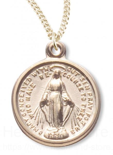 A petite and lovely round Miraculous pendant with an image of Mary in the center and the classic Miraculous text surrounding her.