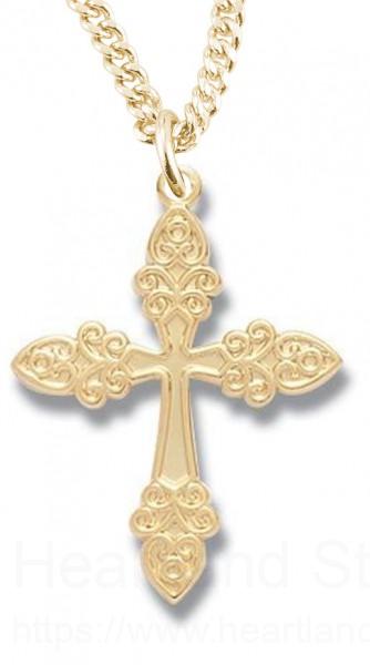 About this Women's 14kt Gold Plated Raised Border Heart Shaped Tip Cross + 18 Inch Gold Plated Chain & Clasp