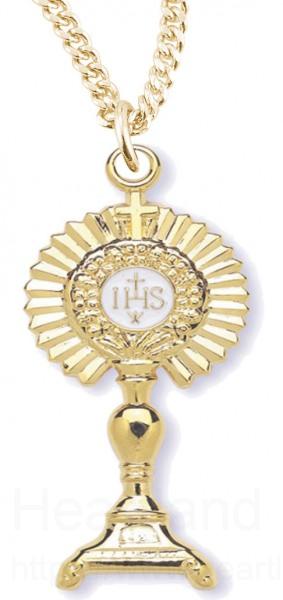 This wonderful two-toned Monstrance Pendant has a white enamel center and is nearly two inches tall. A perfect reminder of the Holy Eucharist.