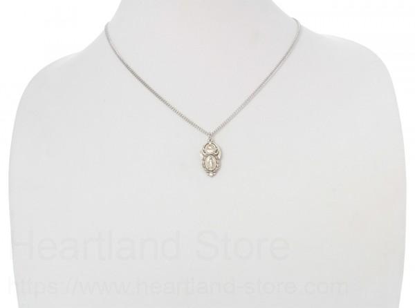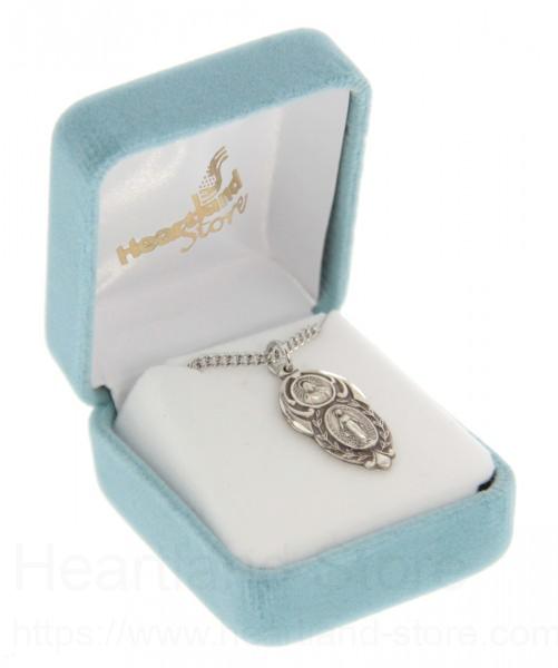This charming Pendant has a round Sacred Heart of Jesus Medal above a oval Miraculous Medal. Both are surrounded with etched leaves.