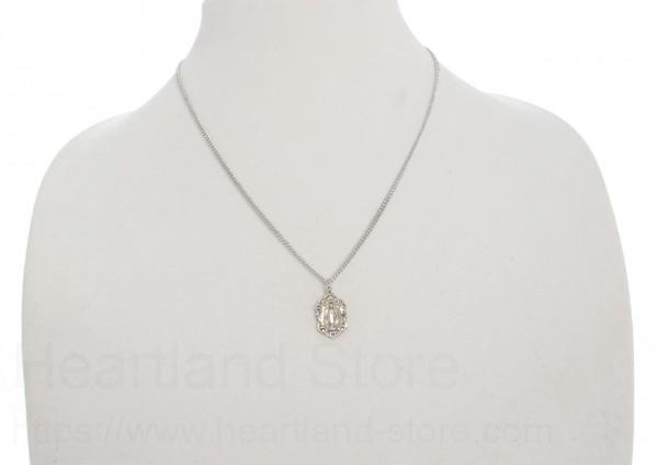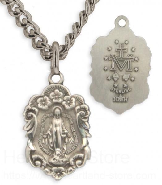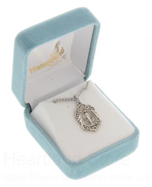 This petite Miraculous necklace is designed with flowers at the top to adorn the Blessed Mother. A very pretty pendant to wear each day.