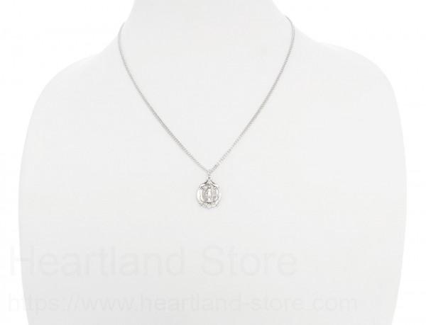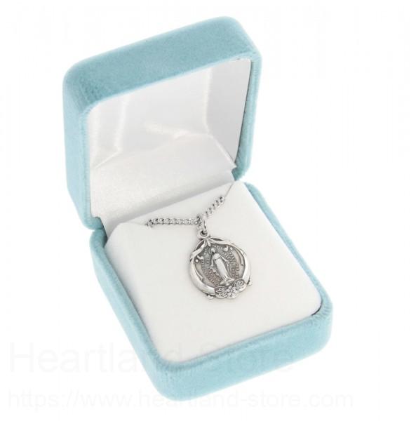 The border of the Miraculous necklace is a flowing banner gently surrounding the Blessed Mother. Two small birds fly beside her, one on each side. A beautiful flower is set in the bottom center. What a touching and feminine necklace!