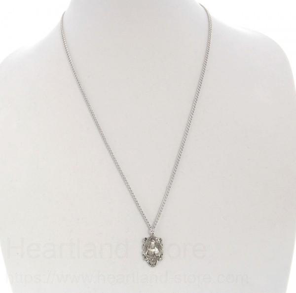 On this necklace we find an image of Christ the King as he is indeed wearing his heavenly Crown! The design of the pendant is that of a biblical scrolls with a beautiful border.