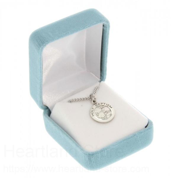 This sweet round Holy Baptism Medal is designed with a christened child in the center and the text around the border which reads "HOLY BAPTISM". Makes for a lovely baptismal keepsake devotional.