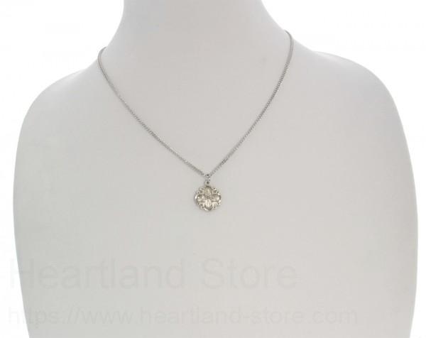A wide edge 4 Way Pendant ideal for a woman or young person. Double sided with a pretty center floral accent.