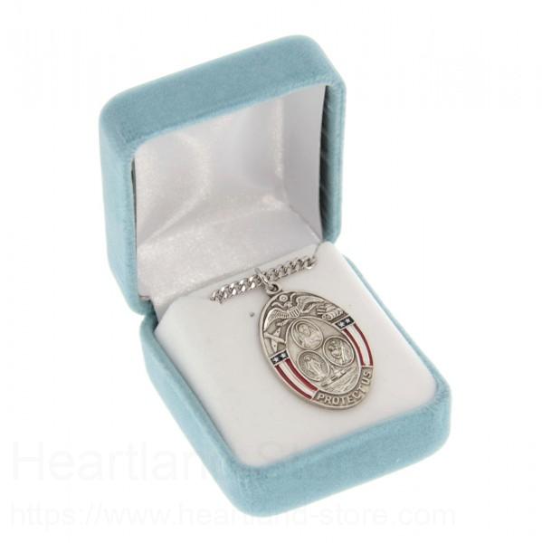 This wonderful oval Military pendant has a 3-Way in the center. A magnificent eagle over the top. A plane, tank and a ship as well as beautiful red, white and blue surround the 3-Way. Protect Us is written at the bottom.
