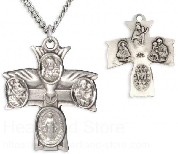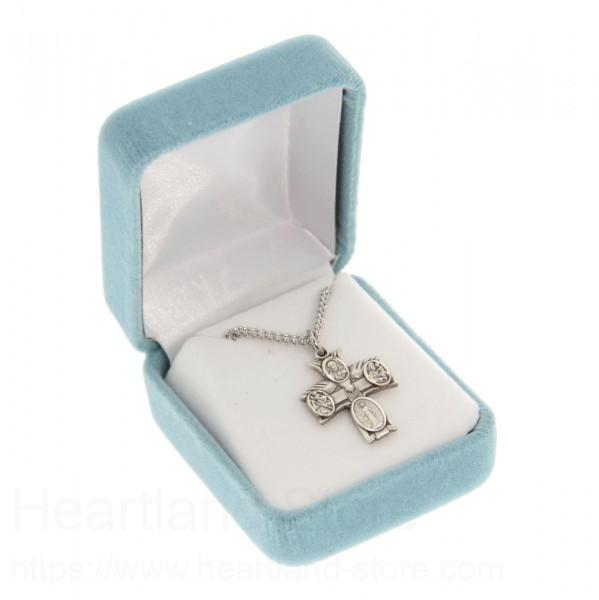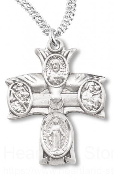 A very unique double-sided four-way cross indeed! The top of the cross is in the shape of a descending dove, the symbol of the Holy Spirit. At each of the cross tips is one of the four way medals, Jesus at the top, Miraculous Medal at the bottom, St. Joseph and St. Christopher at the sides.