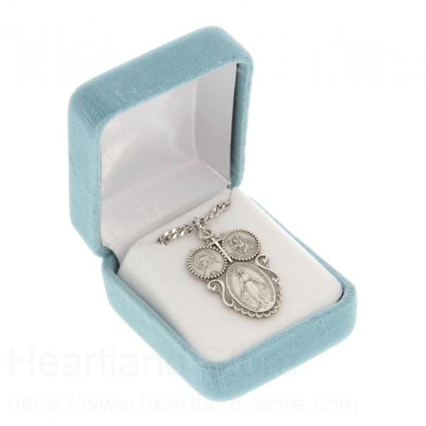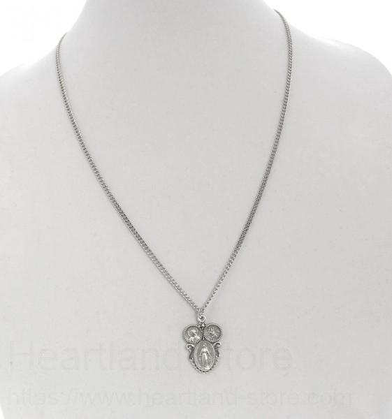 This large baroque 3 Way Pendant is sure to get attention as it is so pretty and so unique! At the very top of the pendant is a small cross followed by a side by side image of Jesus and St. Christopher. At the bottom is a Miraculous medal.