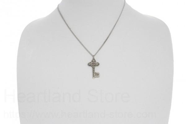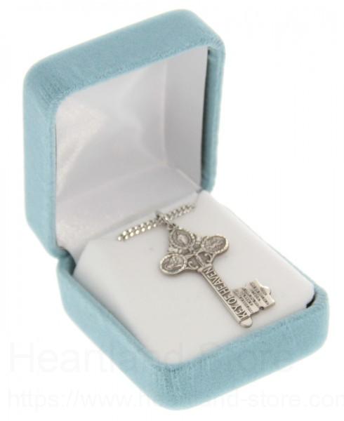 This exquisite Key of Heaven Pendant is shaped like a key. The top of the key displays three-way medals including Sacred Heart, the Miraculous and St. Christopher with a crucifix in the center. The bottom of the key has the text "Key of Heaven" and "What does it profit a main to gain the whole world if he lose his own soul".