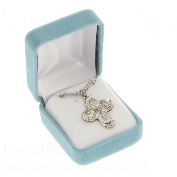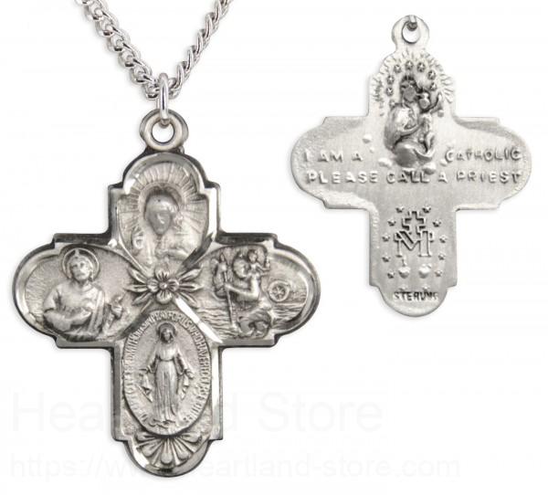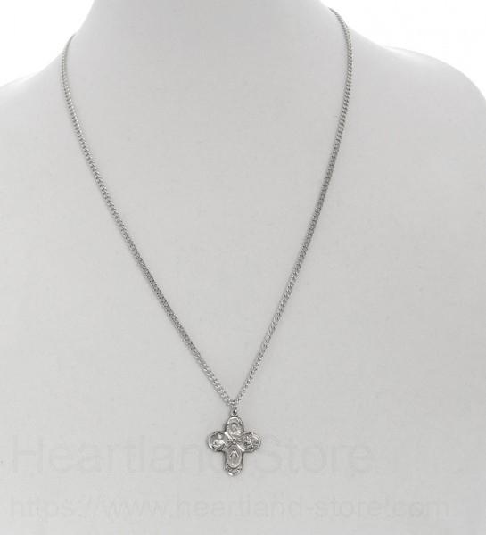 A men's 4-Way pendant with wide budded tips allowing great detail in the four images of Jesus, Mary, St. Christopher and St. Joseph. In the center is a small petal accent flower.