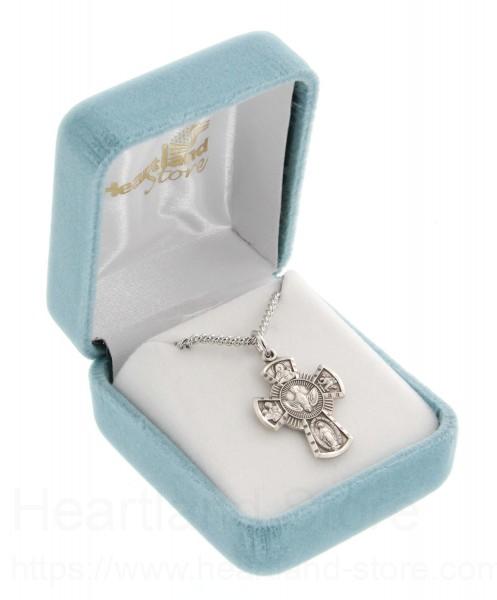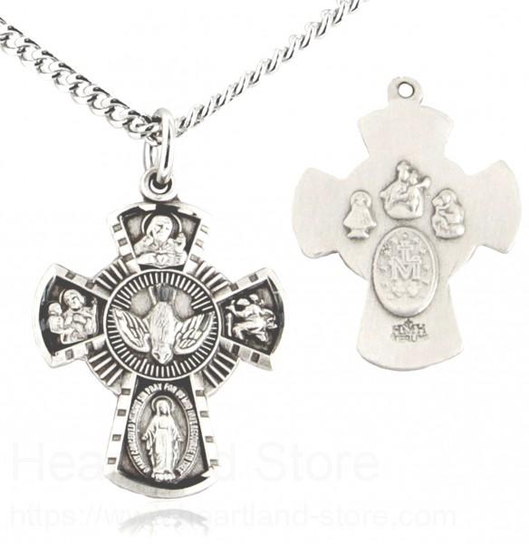 A woman's pendant that combines both a cross and the classic 4-way medals including Jesus, Mary, St. Christopher, St. Joseph and the Holy Spirit in the form of a descending dove.