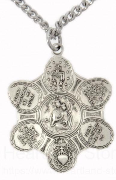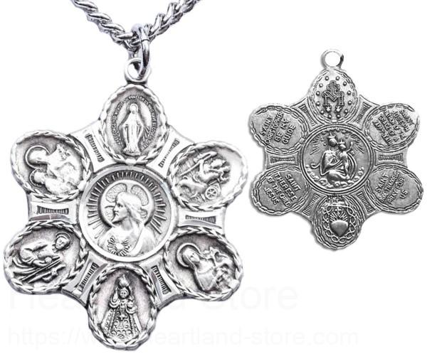 This unique 7 Way Pendant is designed with the Sacred Heart of Jesus in the center and the follow saints and holy persons the Miraculous, St. Christopher, St. Therese, Infant of Prague, St. Jude and St. Joseph.