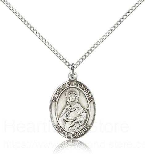 This St. Alexandra Pendant is made of sterling silver and is approximately the size of a nickel. The jewelry pendant is paired with an 18 inch sterling silver light curb chain as pictured. All medals are gift boxed in a beautiful blue velvet hinged jewelry gift box.