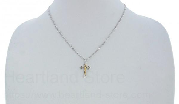 Very attractive two-tone crucifix necklace designed with textured cross tips with hand etchings. An elegant high polish gold-tone corpus with attractive curves.