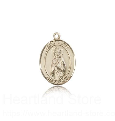 This St. Alice Pendant is made of 14 Karat Gold and is approximately the size of a nickel. The jewelry pendant is sold individually and does not come with a chain. All medals are gift boxed in a beautiful blue velvet hinged jewelry gift box.