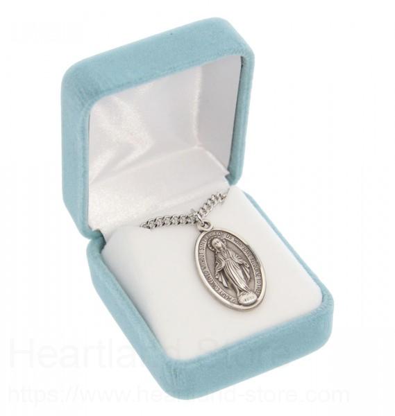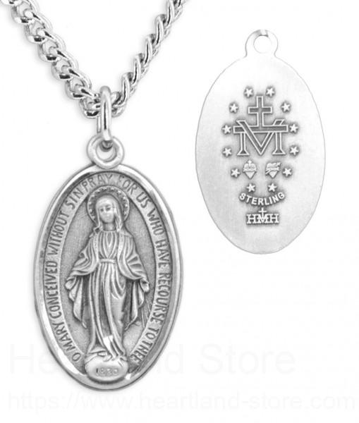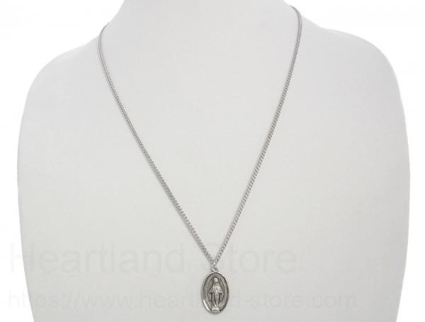 A Men's sized oval Miraculous necklace that is simple yet elegant. On the front is the Blessed Mother and the base reads 1830, the year of the Miraculous medal appirition by Saint Catherine Labouré. Double sided.