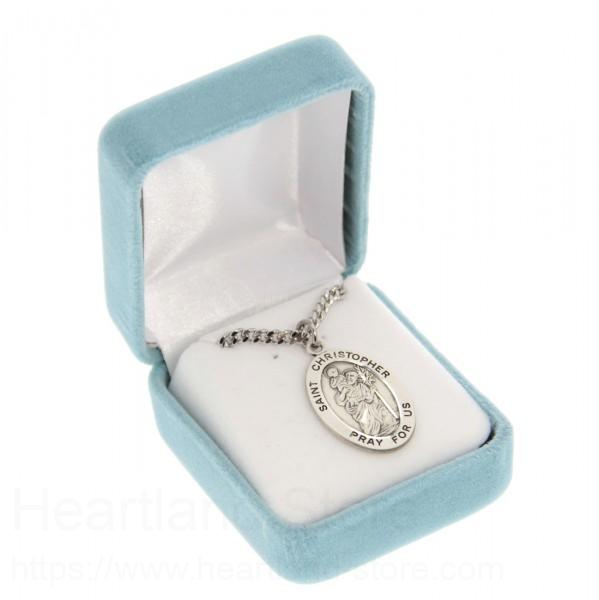 A traditional Saint Christopher necklace with an oval shaped medallion and the words Saint Christopher Protect Us.