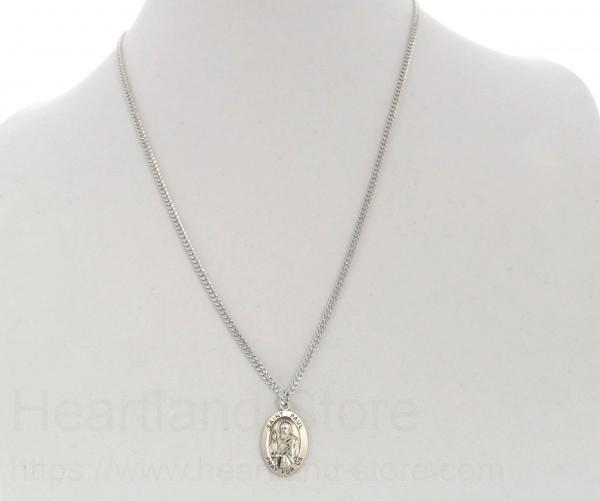 Saint Paul is one of the most popular and influential saints of all time and is displayed in the center of this necklace medallion holding a sword and the bible. He is the patron saint of writers and missionaries.