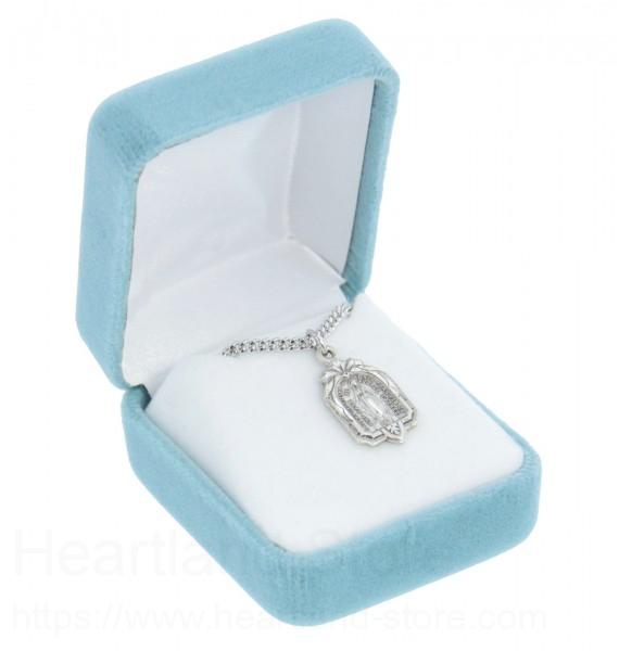 A delicate half oval Miraculous Pendant has a wide ribbon etched border. Simply beautiful!